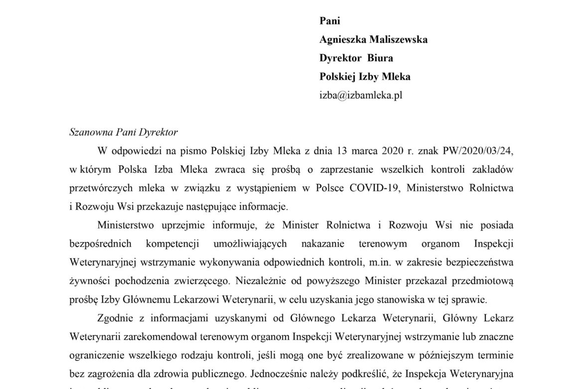 Odpowiedź MRiRW na pismo Polskiej Izby Mleka dot. o zaprzestaniz wszelkich kontroli zakładów przetwórczych mleka w związku z wystąpieniem w Polsce COVID-19,