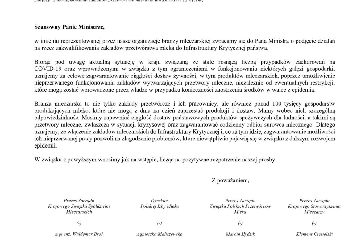 Cztery organizacje branży mleczarskiej tj.Krajowy Związek Spółdzielni Mleczarskich, Polska Izba Mleka, Związek Polskich Przetwórców Mleka oraz Krajowe Stowarzyszenie Mleczarzy skierowały pismo do Pana J.K. Ardanowskiego, Ministra Rolnictwa i Rozwoju Wsi, w sprawie zakwalifikowania zakładów przetwórstwa mleka do Infrastruktury Krytycznej.