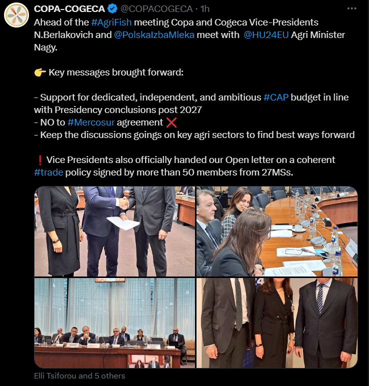 Przedstawiono kluczowe przesłania: – Wsparcie dla dedykowanego, niezależnego i ambitnego budżetu #CAP zgodnie z konkluzjami prezydencji po 2027 r. – NIE dla porozumienia #Mercosur – Kontynuowanie dyskusji na temat kluczowych sektorów rolnictwa w celu znalezienia najlepszych sposobów na przyszłość. Vice Prezydenci oficjalnie przekazali również nasz list otwarty w sprawie spójnej #polityki handlowej podpisany przez ponad 50 członków z 27 państw członkowskich.