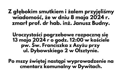 przyjęliśmy wiadomość, że w dniu 8 maja 2024 r. zmarł prof. dr hab. inż. Janusz Budny. Uroczystości