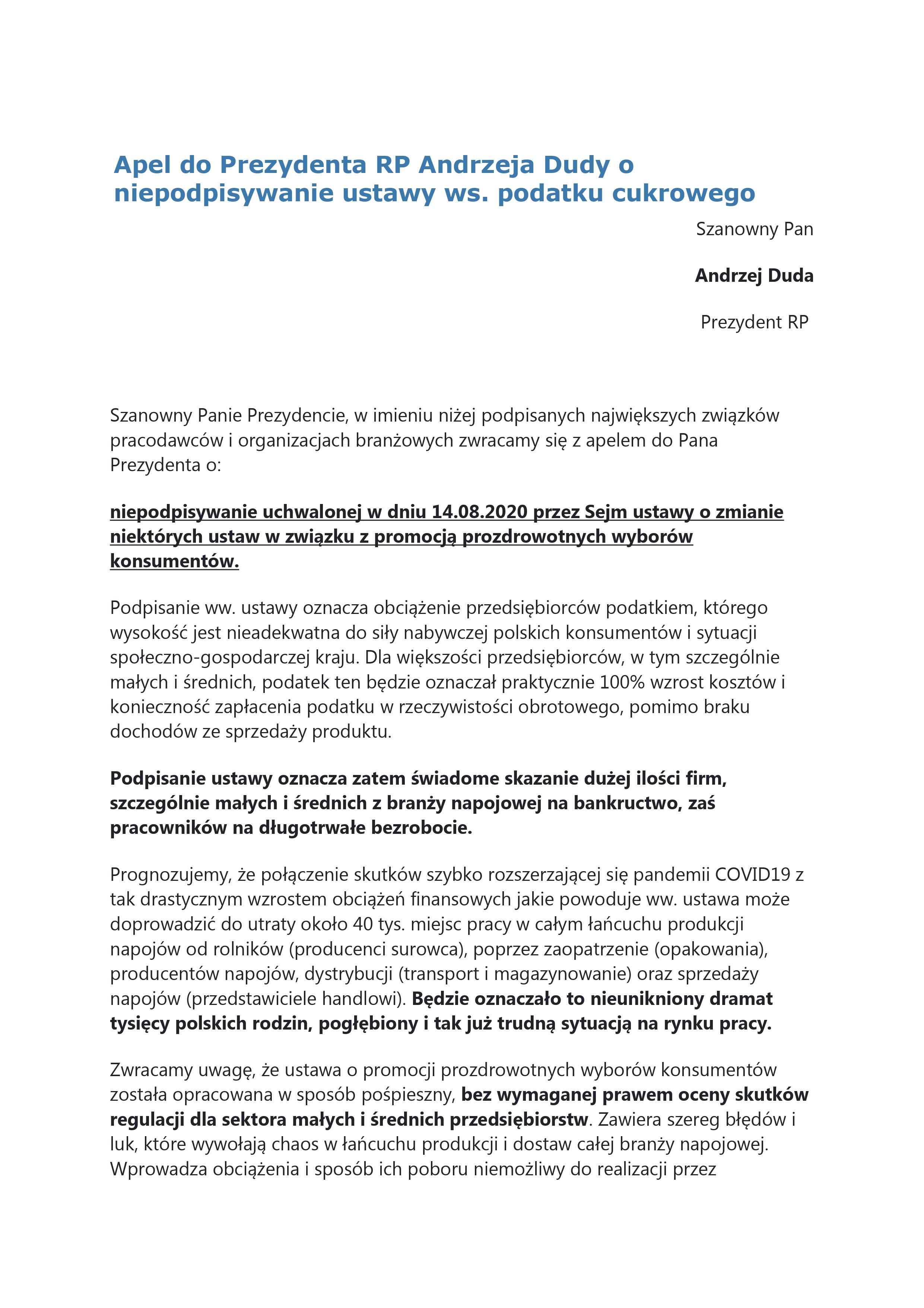 Informujemy, że w związku z uchwaleniem w dniu 14 sierpnia 2020 roku przez Sejm RP ustawy o zmianie niektórych ustaw w związku z promocją prozdrowotnych wyrobów konsumenckich organizacje branżowe wystąpiły z apelem do Prezydenta RP o niepodpisywanie uchwalonej ustawy. Apel jest kontynuacją działań organizacji branżowych zapoczątkowanych w 2019 roku z pojawieniem się zagadnienia wprowadzenia tzw. podatku cukrowego.