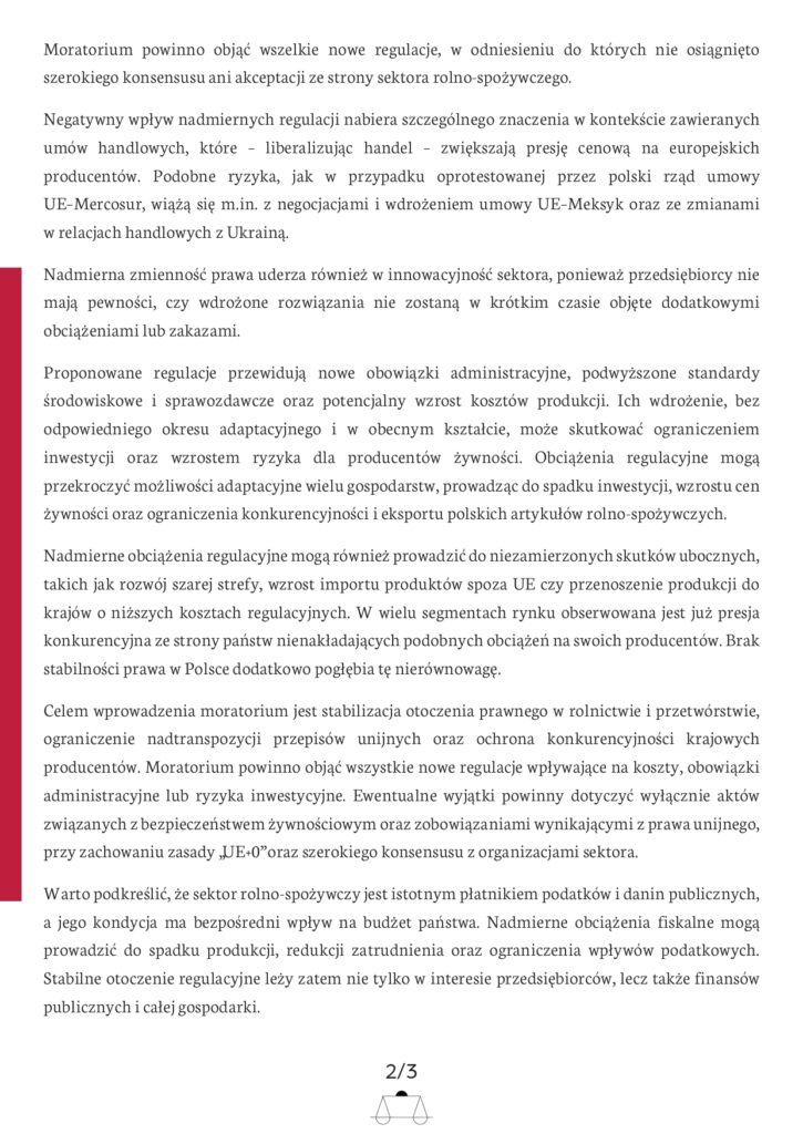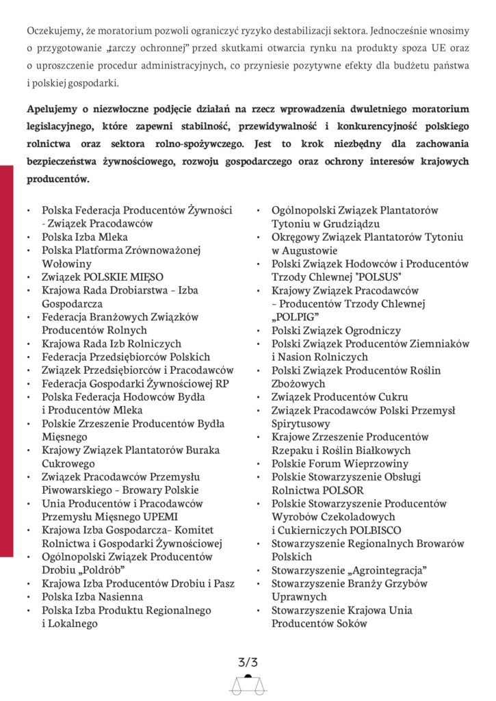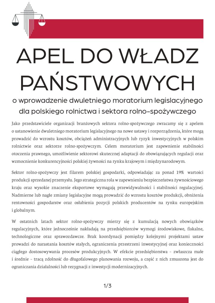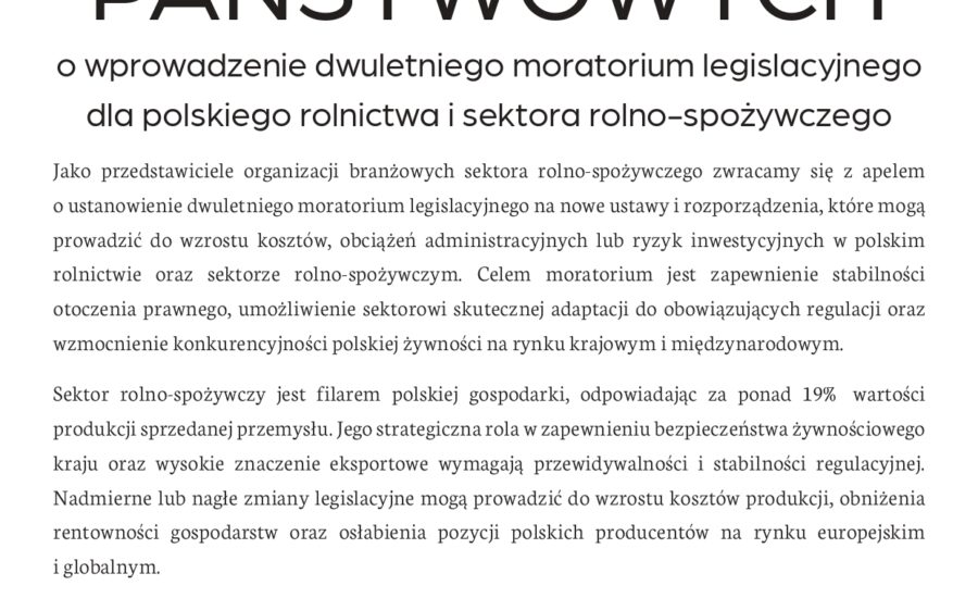 APEL DO WŁADZ PAŃSTWOWYCH o wprowadzenie dwuletniego moratorium legislacyjnegodla polskiego rolnictwa i sektora rolno-spożywczego