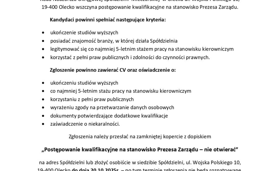 Ogłoszenie o postępowaniu kwalifikacyjnym na stanowisko Prezesa Zarządu w Okręgowej Spółdzielni Mleczarskiej w Olecku Zachęcamy do zapoznania się z ofertą :)