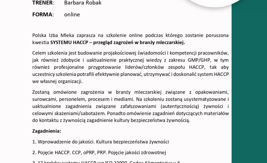 Polska Izba Mleka zaprasza na bezpłatne szkolenie, które poszerzy Państwa wiedzę na temat zagadnień związanych z systemem HACCP – przegląd zagadnień w branży mleczarskiej. Celem szkolenia jest budowanie projakościowej świadomości i kompetencji pracowników,