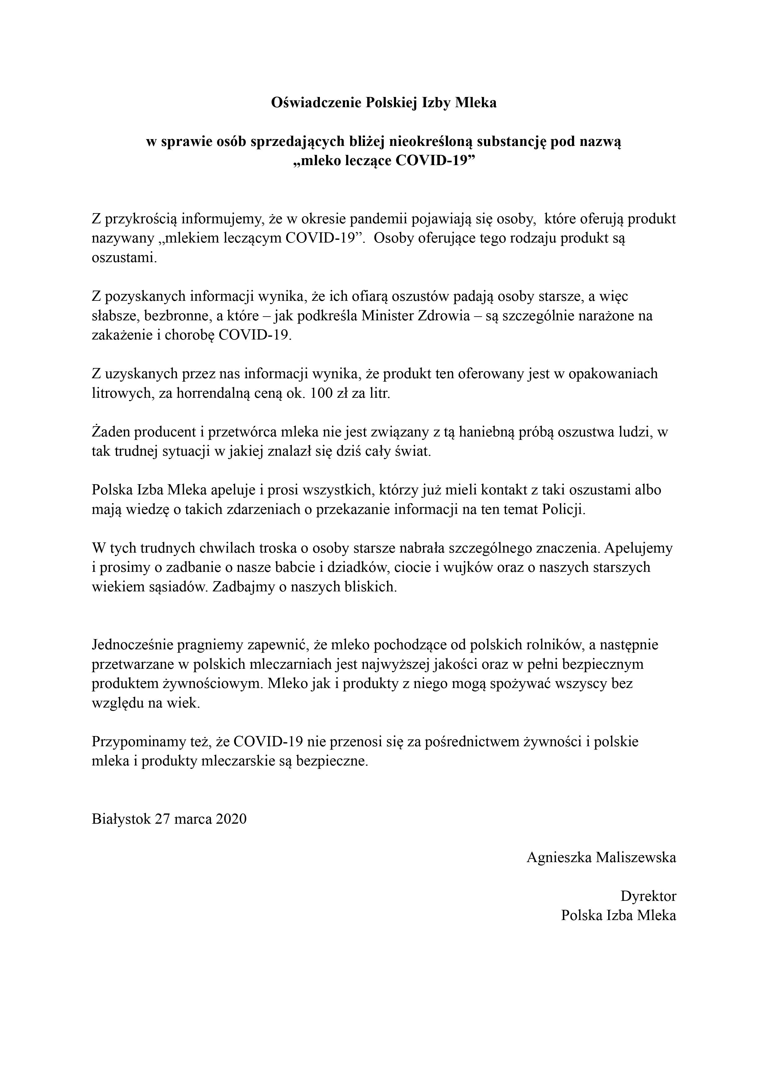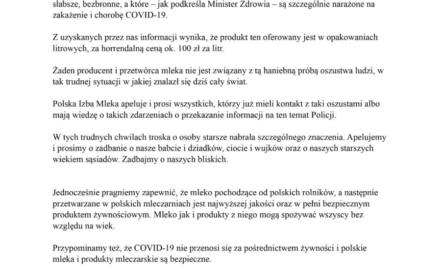 Oświadczenie Polskiej Izby Mleka w sprawie osób sprzedających bliżej nieokreśloną substancję pod nazwą „mleko leczące COVID-19”