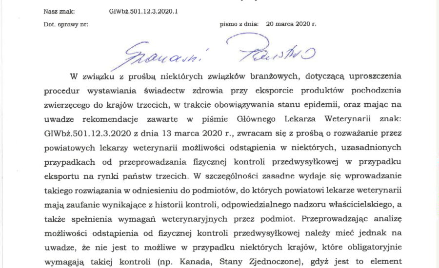 Pismo GLW ws. uproszczenia procedur wystawiania świadectw zdrowia przy eksporcie produktów pochodzenia zwierzęcego do krajów trzecich