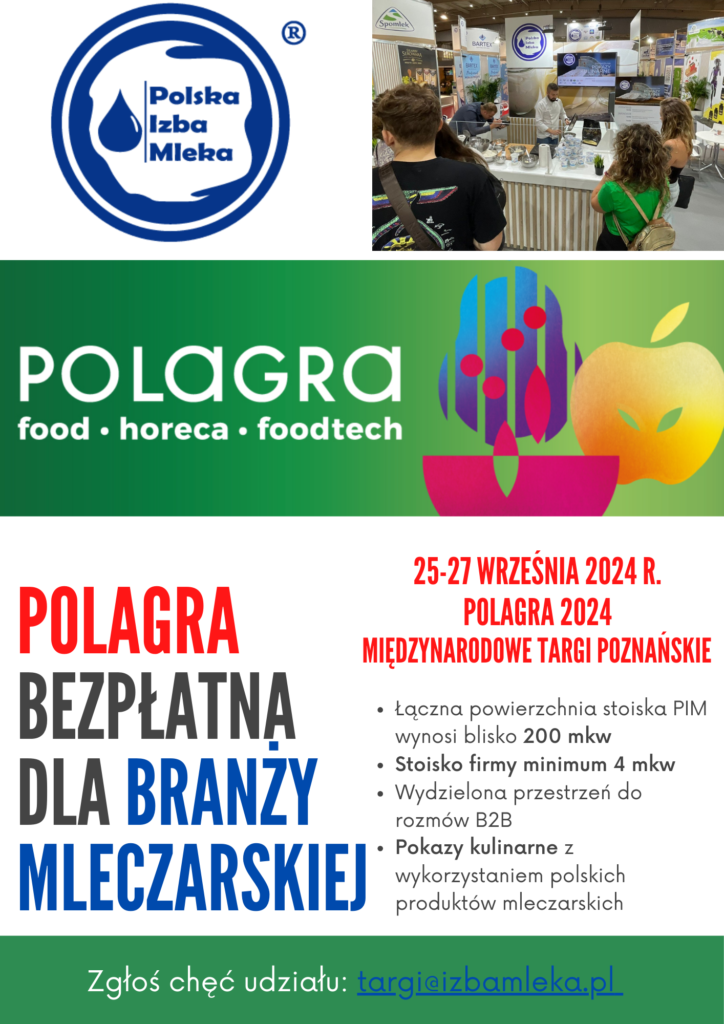 Polska Izba Mleka, czyli największa organizacja branży mleczarskiej i Międzynarodowe Targi Poznańskie podpisały umowę o współpracy przy organizacji targów POLAGRA, które odbędą się w Poznaniu 25–27 września 2024. Dzięki temu przedstawiciele firm branży mleczarskiej będą mogli, nie ponosząc żadnych kosztów, uczestniczyć w wydarzeniu i zaprezentować swoje produkty na wspólnym stoisku Polskiej Izby Mleka. Jego łączna powierzchni to niemal 200 m kw.