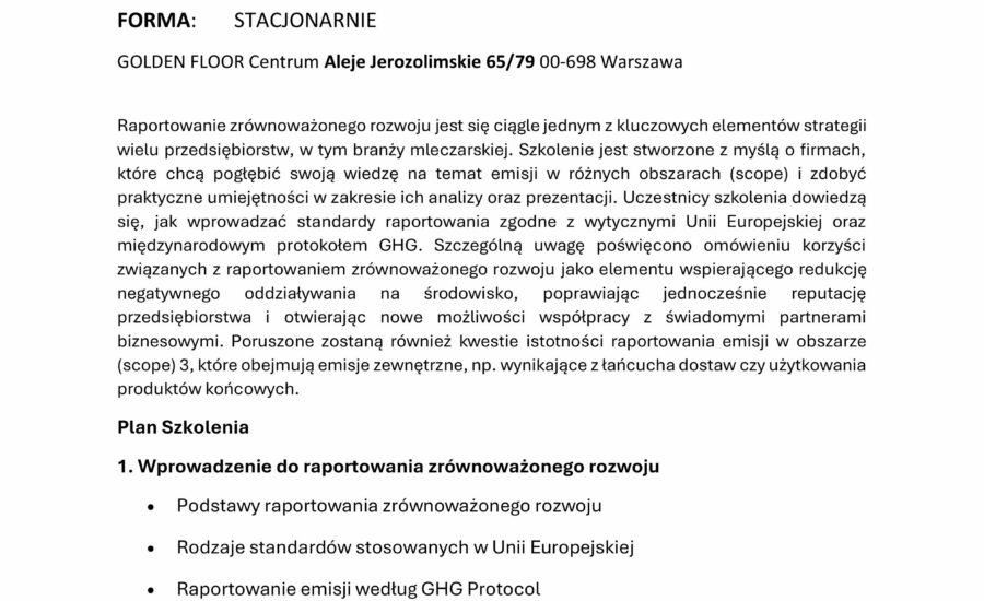 Raportowanie zrównoważonego rozwoju jest się ciągle jednym z kluczowych elementów strategii wielu przedsiębiorstw, w tym branży mleczarskiej. Szkolenie jest stworzone z myślą o firmach, które chcą pogłębić swoją wiedzę na temat emisji w różnych obszarach (scope) i zdobyć praktyczne umiejętności w zakresie ich analizy oraz prezentacji. Uczestnicy szkolenia dowiedzą się, jak wprowadzać standardy raportowania zgodne z wytycznymi Unii Europejskiej oraz międzynarodowym protokołem GHG. Szczególną uwagę poświęcono omówieniu korzyści związanych z raportowaniem zrównoważonego rozwoju jako elementu wspierającego redukcję negatywnego oddziaływania na środowisko, poprawiając jednocześnie reputację przedsiębiorstwa i otwierając nowe możliwości współpracy z świadomymi partnerami biznesowymi. Poruszone zostaną również kwestie istotności raportowania emisji w obszarze (scope) 3, które obejmują emisje zewnętrzne, np. wynikające z łańcucha dostaw czy użytkowania produktów końcowych.