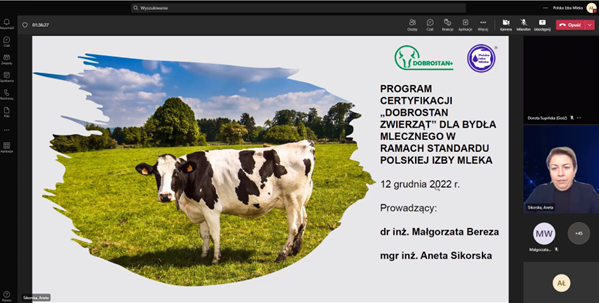 W dniu dzisiejszym tj. 12.12.2022 r. odbyło się spotkanie online dotyczące programu certyfikacji ,,Dobrostan zwierząt” opracowanego przez Polską Izbę Mleka. W spotkaniu wzięli udział przedstawiciele działów skupów w mleczarniach, osoby odpowiedzialne za nadzór nad jakością dostarczanego mleka i współpracę z hodowcami, doradcy rolniczy, rolnicy indywidualni oraz osoby zainteresowane dobrostanem krów mlecznych.
