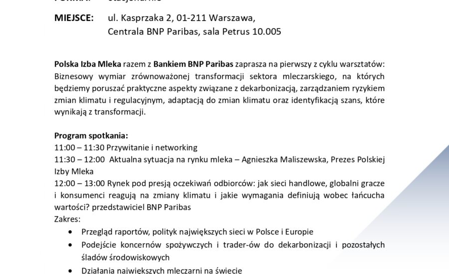 Polska Izba Mleka razem z Bankiem BNP Paribas zaprasza na pierwszy z cyklu warsztatów: Biznesowy wymiar zrównoważonej transformacji sektora mleczarskiego, na których będziemy poruszać praktyczne aspekty związane z dekarbonizacją, zarządzaniem ryzykiem zmian klimatu i regulacyjnym, adaptacją do zmian klimatu oraz identyfikacją szans, które wynikają z transformacji.