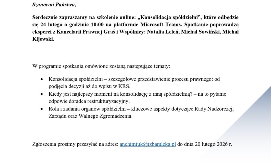 Polska Izba Mleka zaprasza na szkolenie online: „Konsolidacja spółdzielni”, które odbędzie się 24 lutego o godzinie 10:00 na platformie Microsoft Teams. Spotkanie poprowadzi ekspert z Kancelarii Prawnej Graś i Wspólnicy.