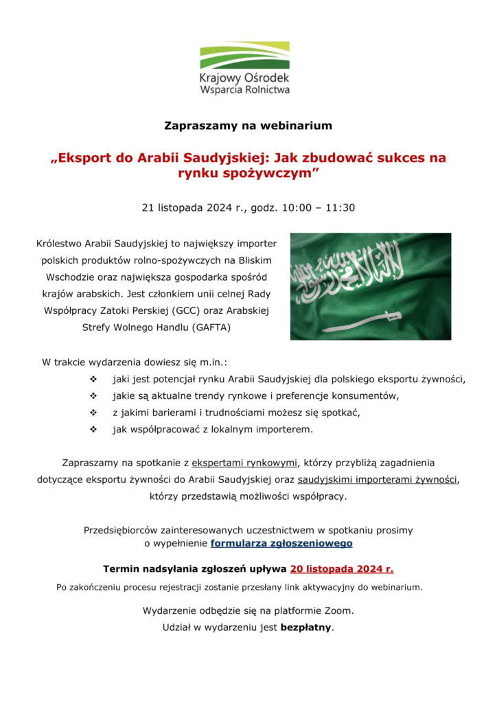 Zaproszenie na webinarium „Eksport do Arabii Saudyjskiej: Jak zbudować sukces na rynku spożywczym”